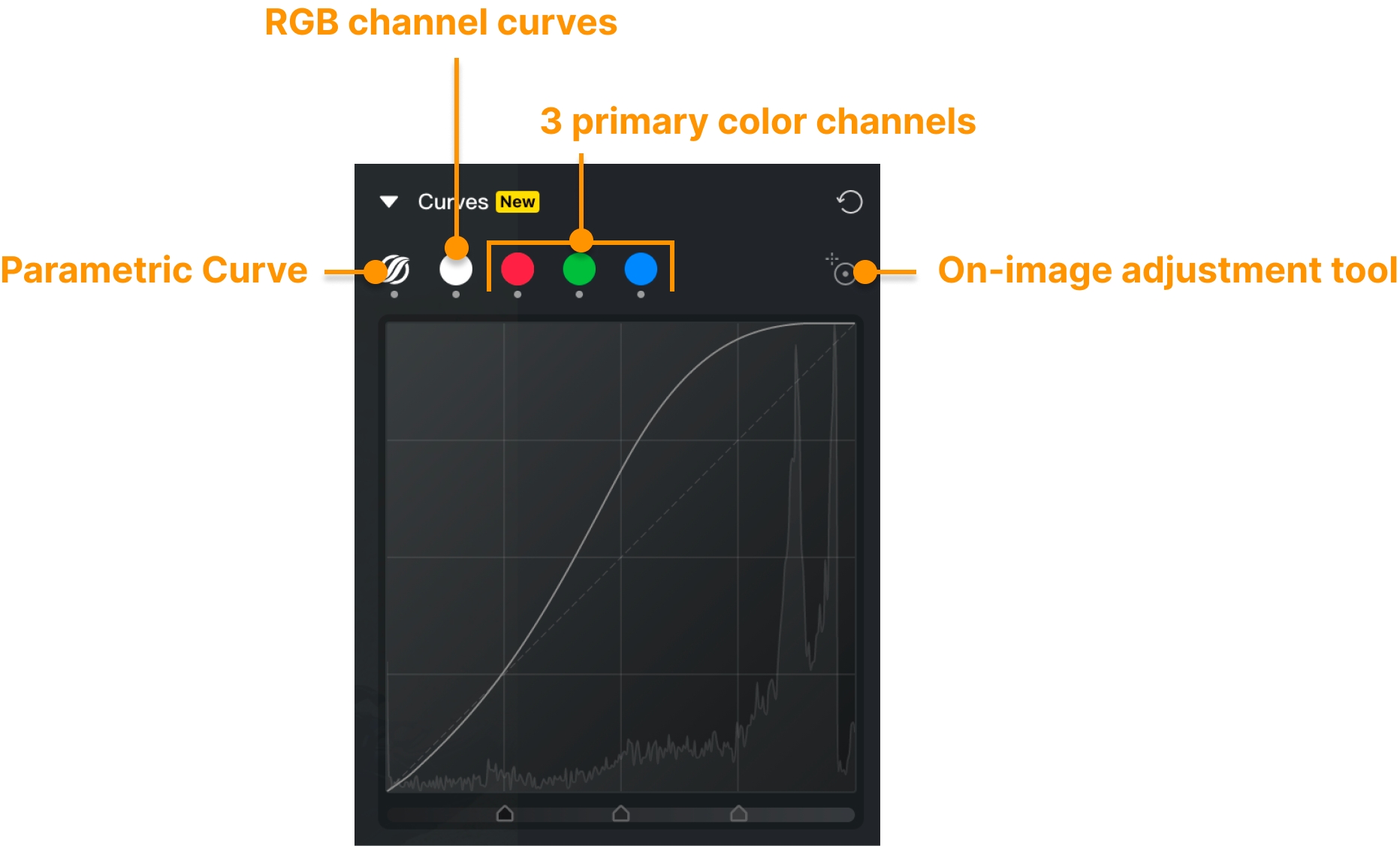Proporciona una curva editable para que puedas ajustar precisamente los valores de píxeles en diferentes niveles de brillo en la imagen agregando, eliminando o moviendo puntos de control (puedes agregar hasta 16 puntos de control). La característica de la curva se puede dividir en dos tipos: curva paramétrica, curva RGB y curva de un solo canal para los tres colores primarios.