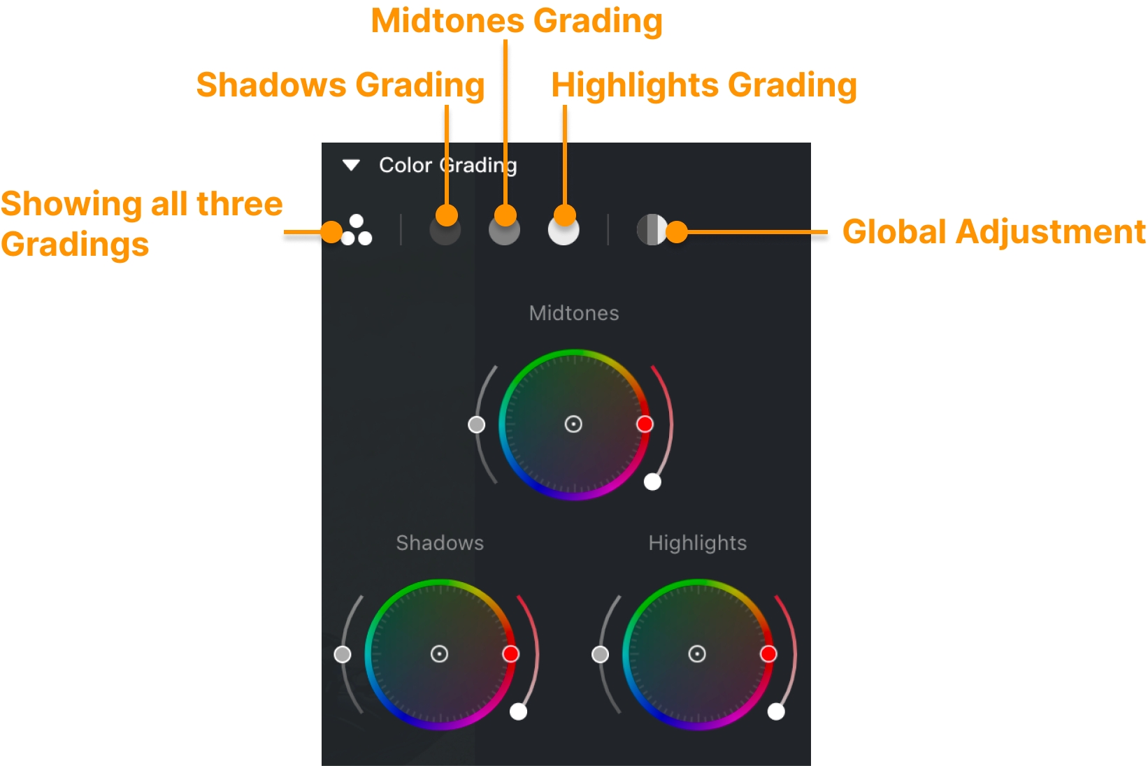 La gradación de color divide la imagen en tres partes: Iluminación, Sombras y Tonalidades medias. Ofrece una opción para ajustar estas tres posiciones de manera individual. Selecciona la parte que necesita ser ajustada y arrastra el punto para modificar el color. Cuanto más cerca del centro, menor será la saturación. Cuanto más cerca del borde, mayor será la saturación del color.