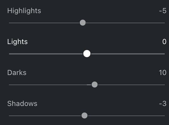 Sombras - Las sombras son las áreas más oscuras de una imagen. Ajustar las sombras cambiará la oscuridad y el tinte de la zona más oscura de la imagen.