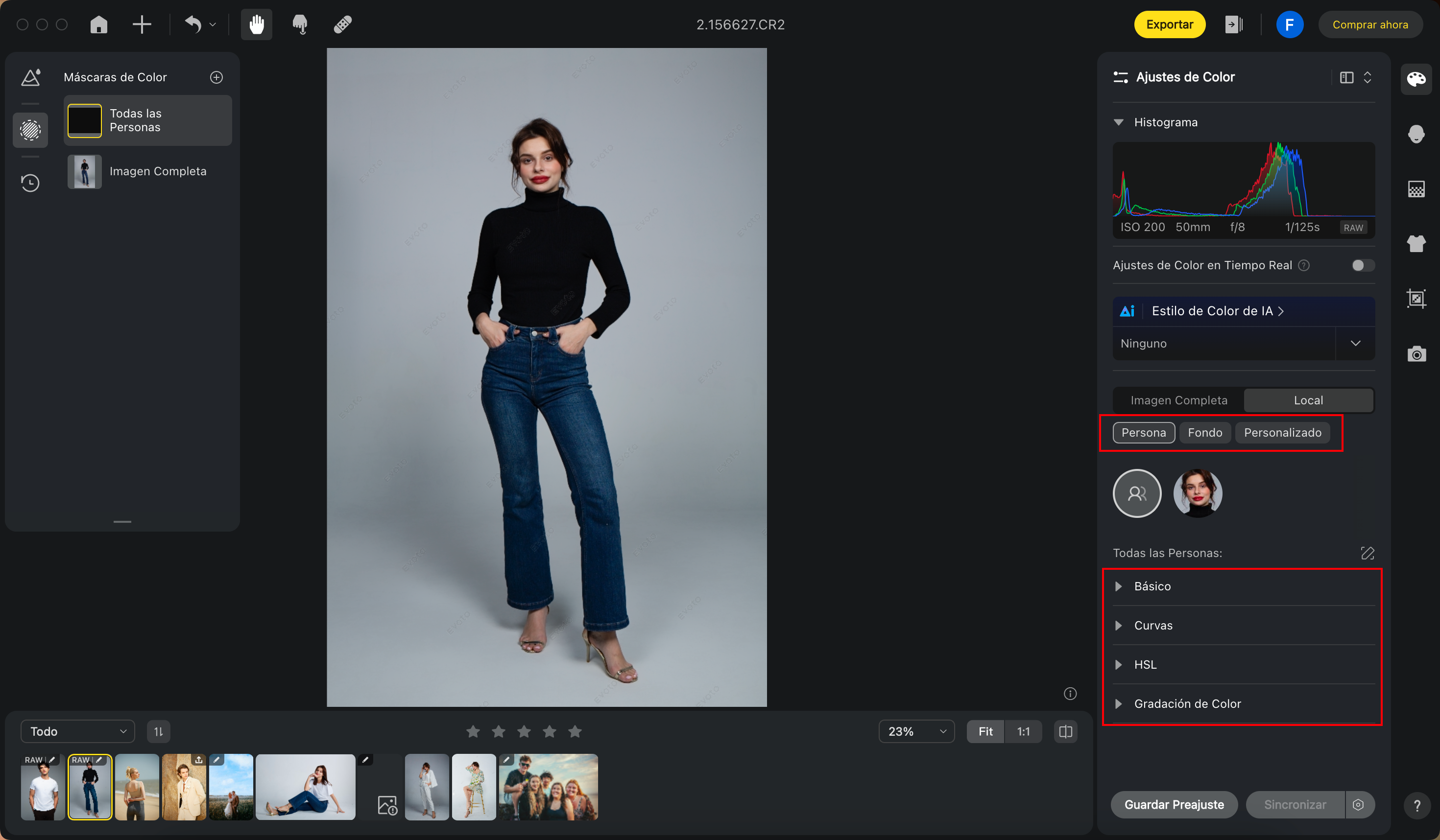 Ten en cuenta que el ajuste de color local para cada máscara individual identificada (incluida la selección detallada de cada máscara individual identificada) o la máscara personalizada, no se puede sincronizar ni guardar como un preset.