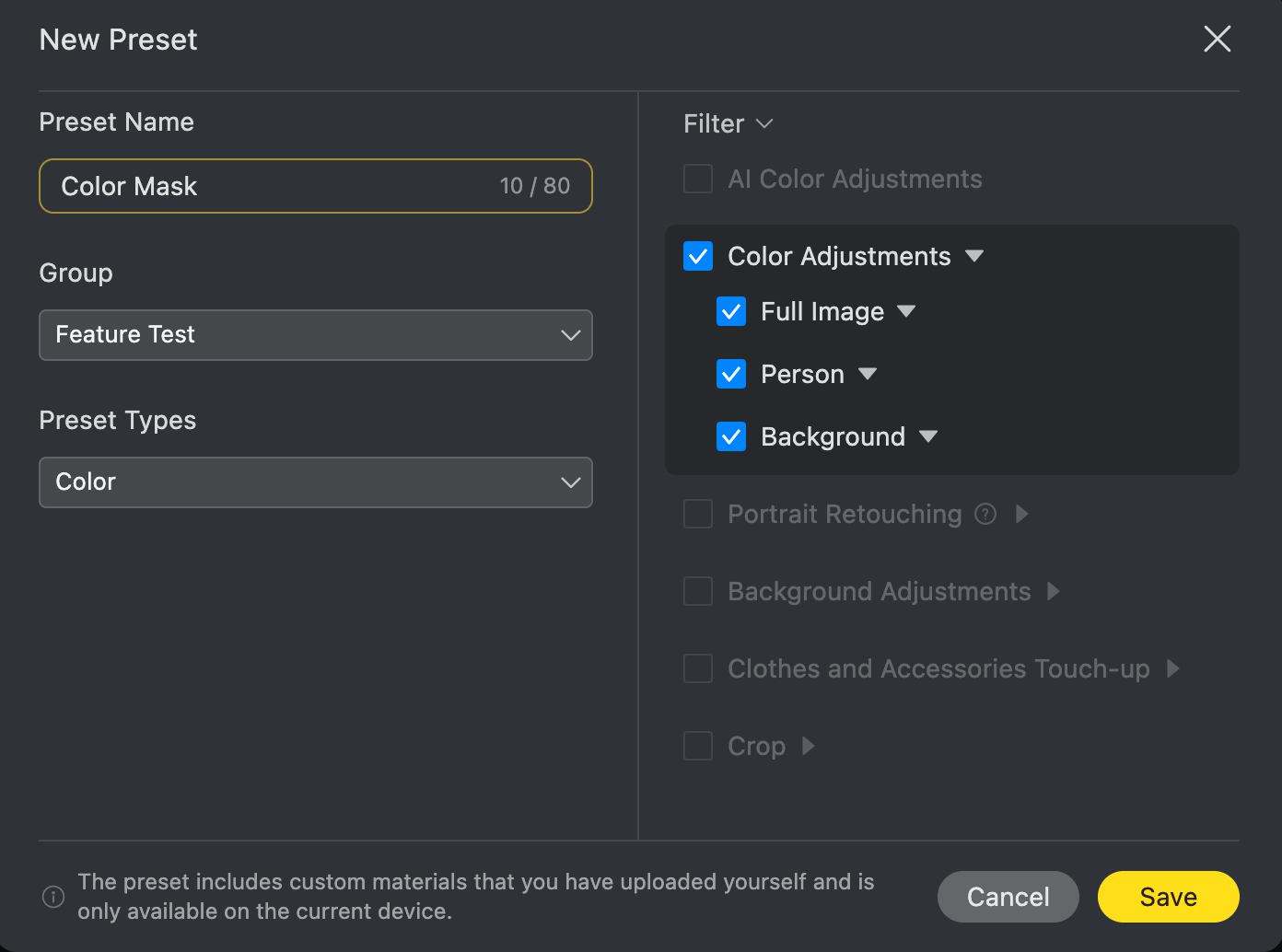 Actualmente, con la máscara local, soportamos la sincronización y el guardado del preset para el ajuste de color local en la imagen completa, Persona (no para cada individuo identificado) y fondo.