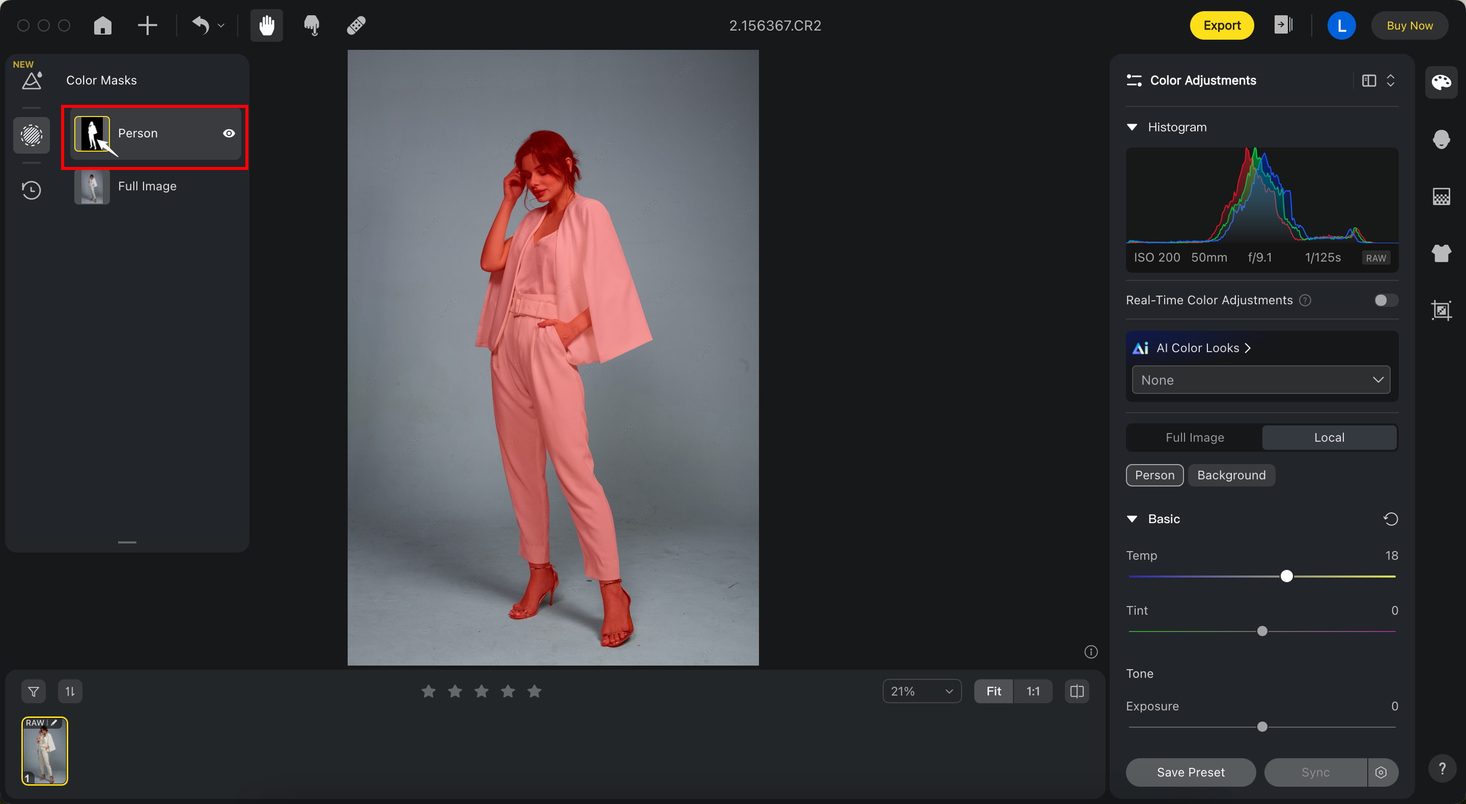 **Paso 2**. En la máscara local, selecciona la máscara que te gustaría generar y cambia cualquier opción bajo el ajuste de color de la máscara local. AI generará automáticamente una máscara basada en tu selección.