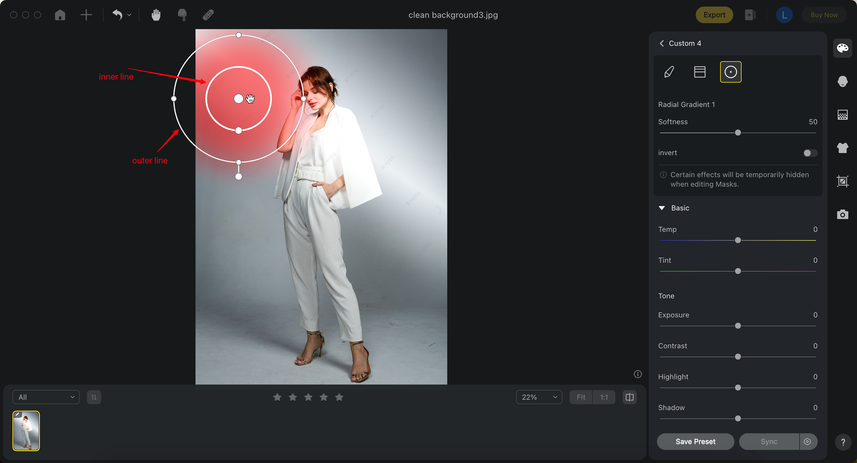 * Haz clic en Degradado Radial, y podrás encontrar la creación de la máscara en la sección de vista previa de la imagen. Verás dos líneas elípticas, que son la línea interior y la línea exterior, para formar una máscara de degradado radial.
