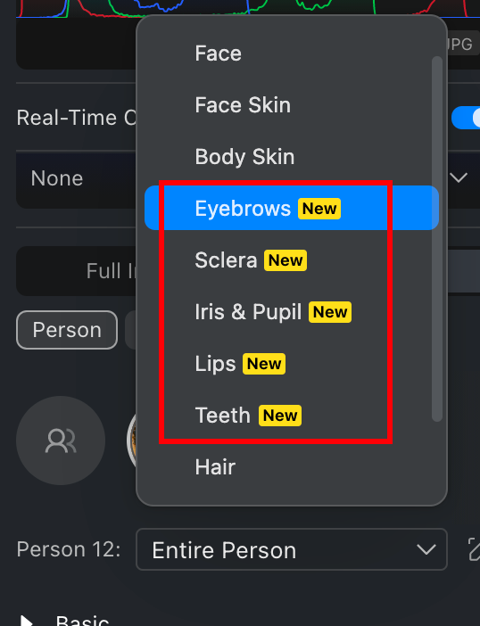 Nueva máscara de características faciales para el enmascaramiento local: Se ha añadido la selección de máscara de características faciales para la selección individual de la máscara de una persona: cejas, esclerótica, iris y pupila, labios y dientes.