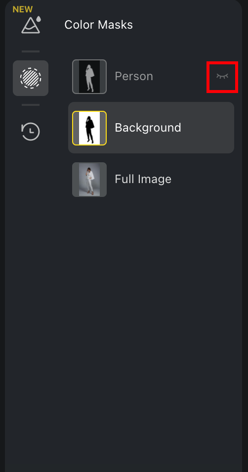 * Oculta el efecto de ajuste de color de la máscara seleccionada, y no se incluirá al exportar la imagen.