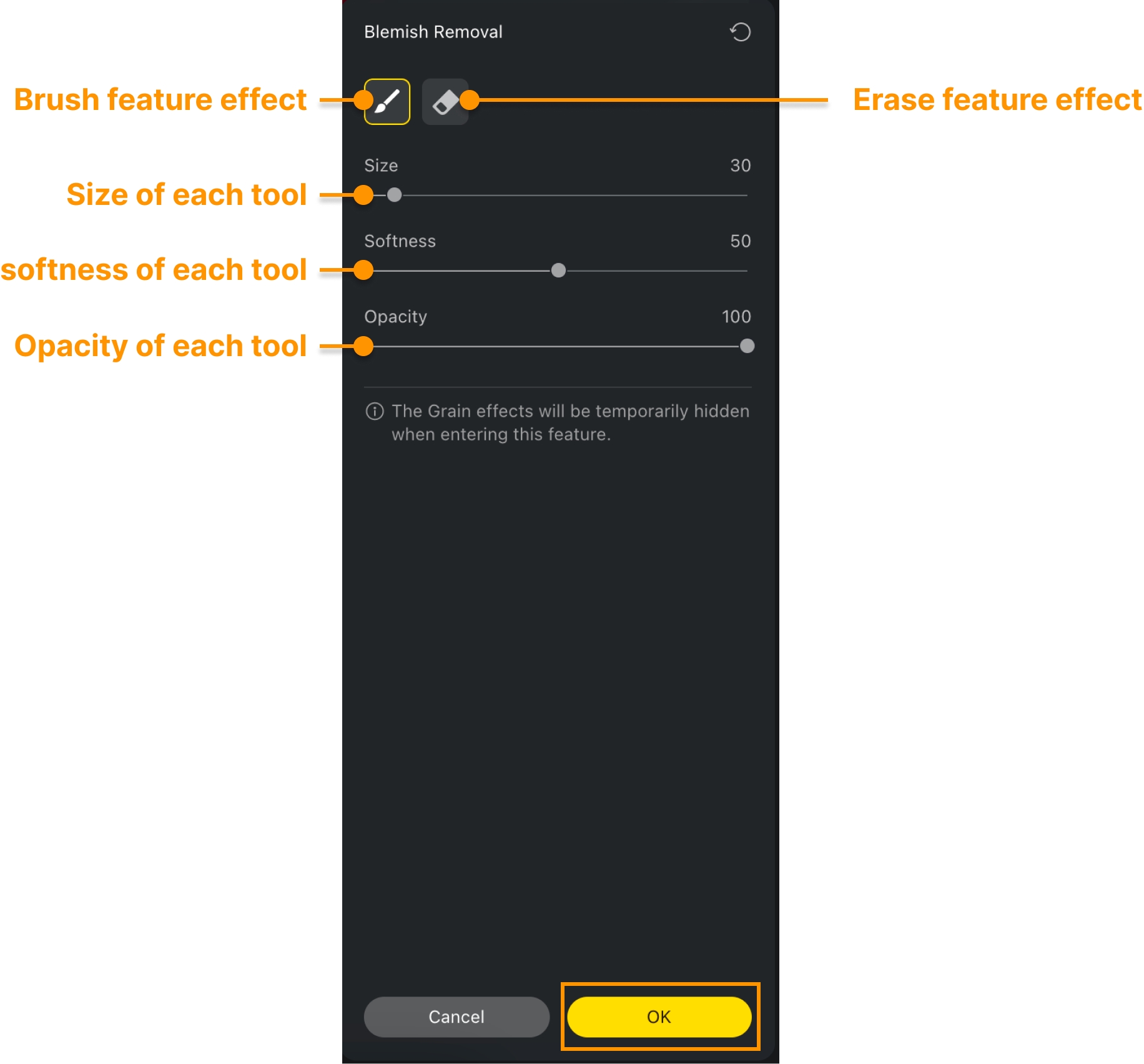 Para el grupo de funciones de Eliminación de Manchas, tiene su propio lápiz de ajuste manual para cepillar o borrar el efecto de la función aplicado en la imagen.