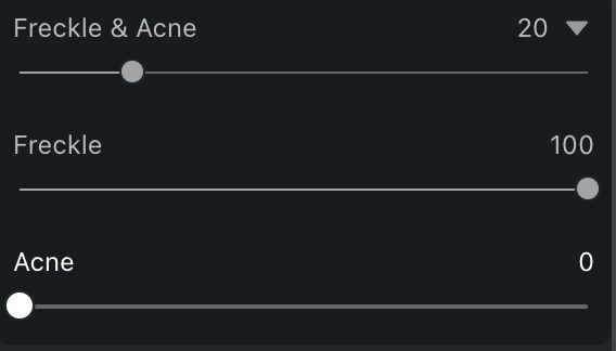 Hemos diferenciado la eliminación de Pecas y Acné. Necesitarás aplicar primero la función de Pecas y Acné para activar los deslizadores de Pecas y Acné.