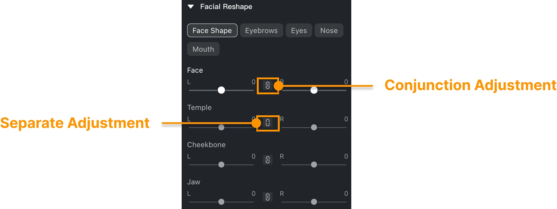 Algunas de las características del Remodelación Facial se pueden ajustar juntas tanto del lado izquierdo como del derecho (ajuste conjunto) o por separado (ajuste separado). Haz clic en el icono de enlace en el medio para desbloquear los ajustes separados izquierdo/derecho, esto te otorga la capacidad de personalizar de manera fluida los efectos de contorno para cada lado individual del rostro.