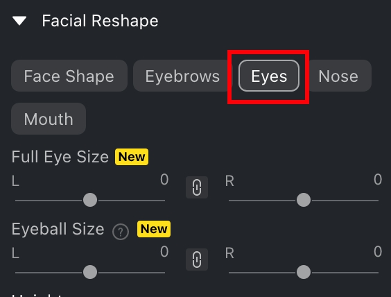 La función de Ojos en Remodelación Facial admite ajustes enfocados en el tamaño de los ojos, altura o ancho del ojo, espacio entre los ojos, inclinación y posición. Si deseas ajustar el brillo de los ojos o añadir un punto brillante para que tu personaje se vea más vívido y natural, puedes usar el Grupo de Características de Ojos. Eyes Feature Group