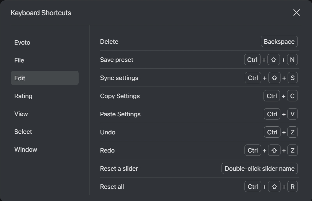 [Ctrl + C/V]: Pulse [Ctrl + C] para seleccionar la imagen actual y copiar sus ajustes;y [Ctrl + V] para aplicar los ajustes copiados a las imágenes seleccionadas.