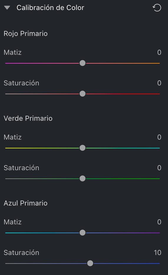 Calibración de Color para ajustar el Matiz y la Saturación de los tres colores primarios, corrigiendo la desviación de color en la imagen para hacerla más precisa y realista.