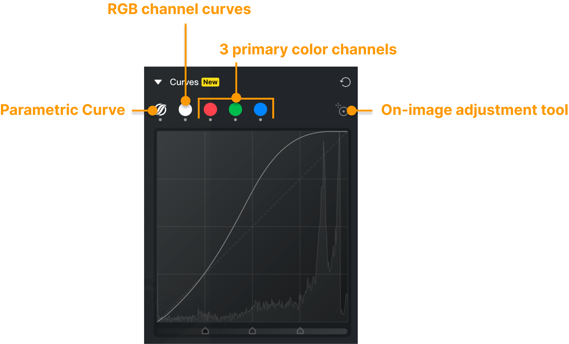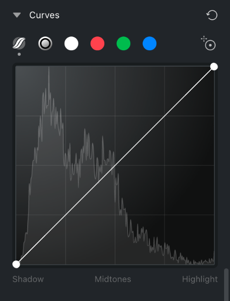 Ajusta fácilmente los tres canales de color primarios de la imagen al mismo tiempo con las Curvas RGB. Mueve los puntos de control en la curva para aumentar o disminuir el brillo y el contraste. Subir la curva eleva el brillo de la imagen, mientras que bajarla reduce el brillo.