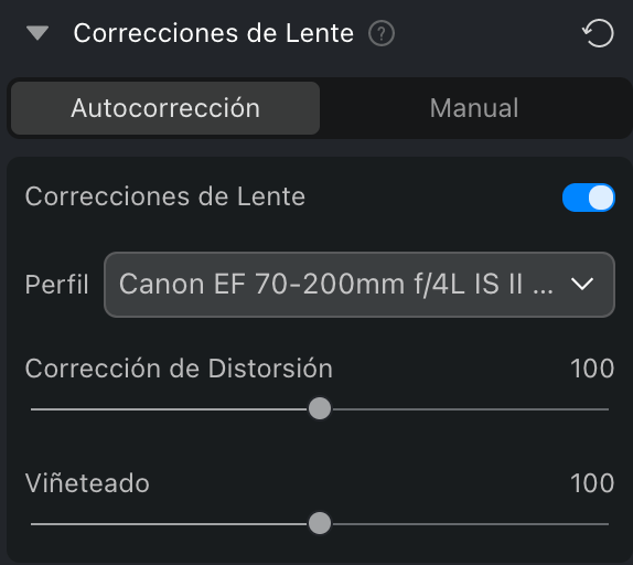 **Configuración Interna -** Si la imagen contiene un perfil de lente incrustado, aunque los datos coincidan con precisión, la configuración predeterminada permanecerá desactivada y se utilizará directamente el perfil incrustado.