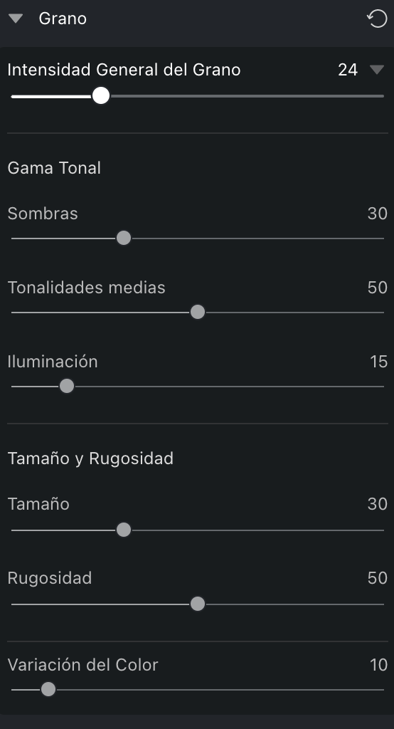 **Tonalidades medias**: Desliza el control deslizante para controlar la intensidad del efecto de grano en la zona de medios tonos.&#x20;