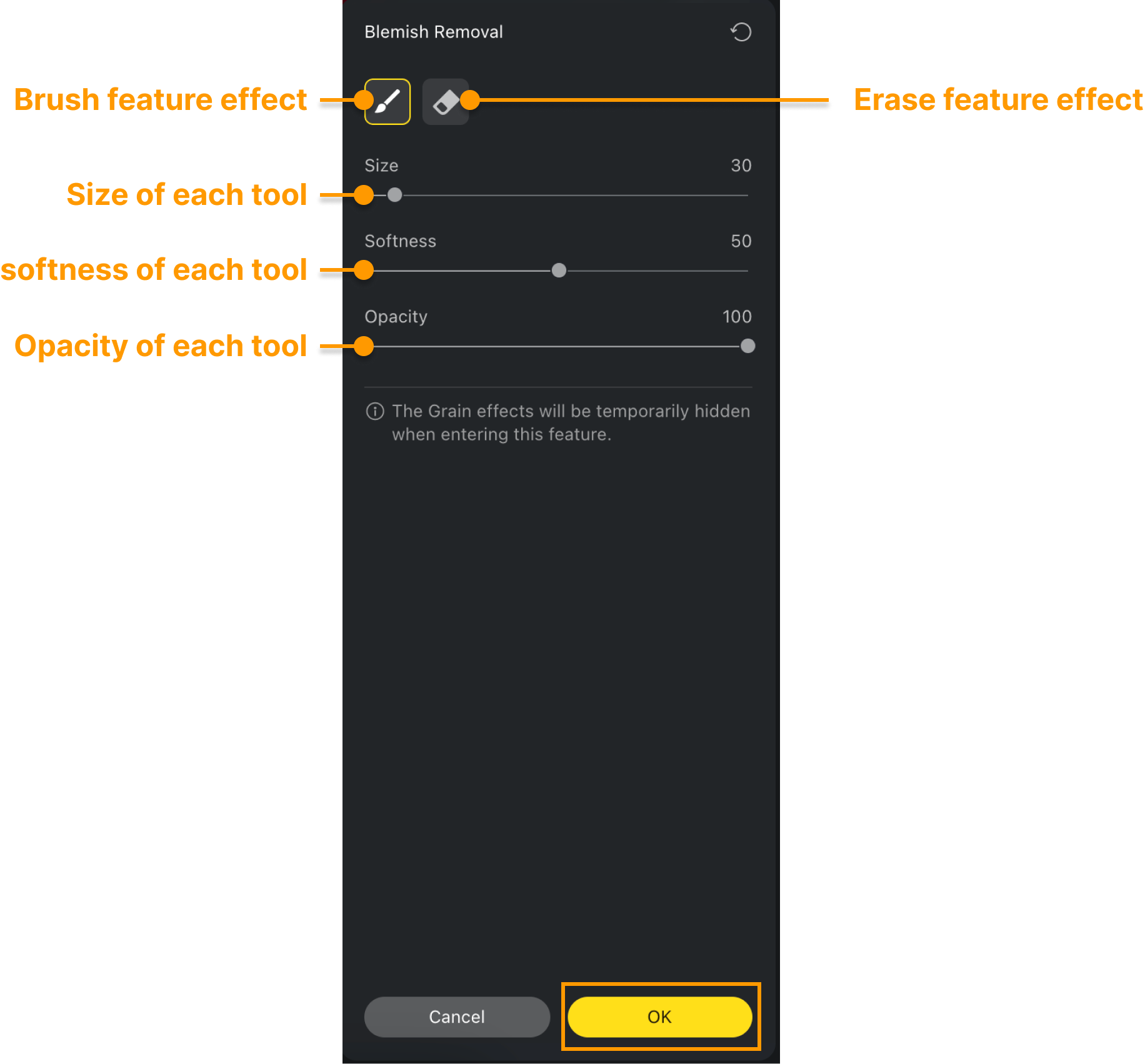 Para el grupo de funciones de Eliminación de Manchas, tiene su propio lápiz de ajuste manual para cepillar o borrar el efecto de la función aplicado en la imagen.