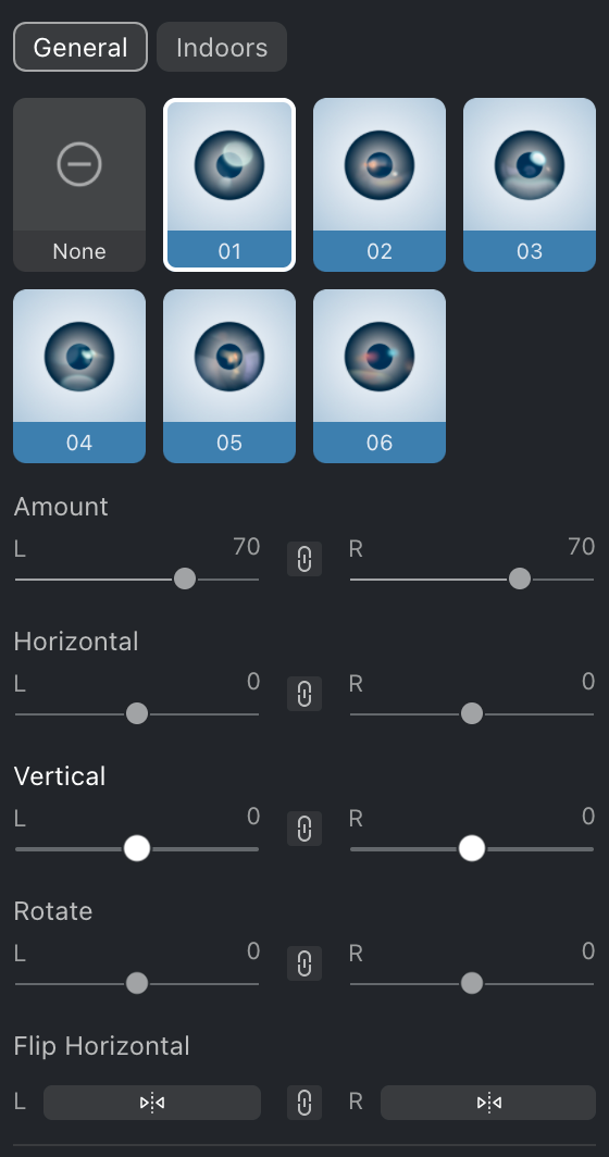 Un total de 12 efectos de Ojos Brillantes, 6 para General y 6 para Interiores. Usa el deslizador para aplicar diferentes niveles de brillo después de seleccionar, para hacer que los ojos sean más brillantes y atractivos.