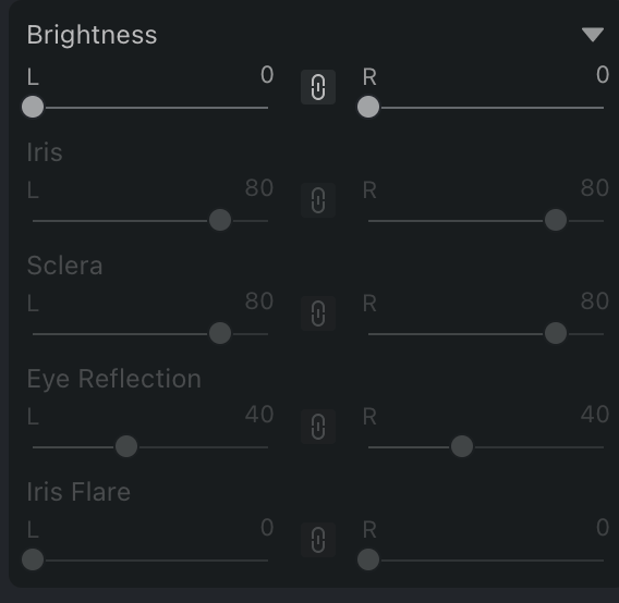 Brillo – El brillo general de los ojos del personaje y todas sus subcaracterísticas pueden ajustarse conjuntamente (ajuste conjunto) o por separado (ajuste separado) para el lado izquierdo y derecho.