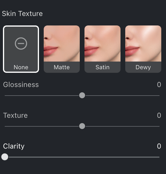Admite ajustes finos en el deslizador de brillo, textura y claridad para crear la textura facial del personaje. También puedes hacer clic en los tres nuevos presets de textura de piel (satinado, mate, rocío) para agregar rápidamente el tipo de textura de piel.
