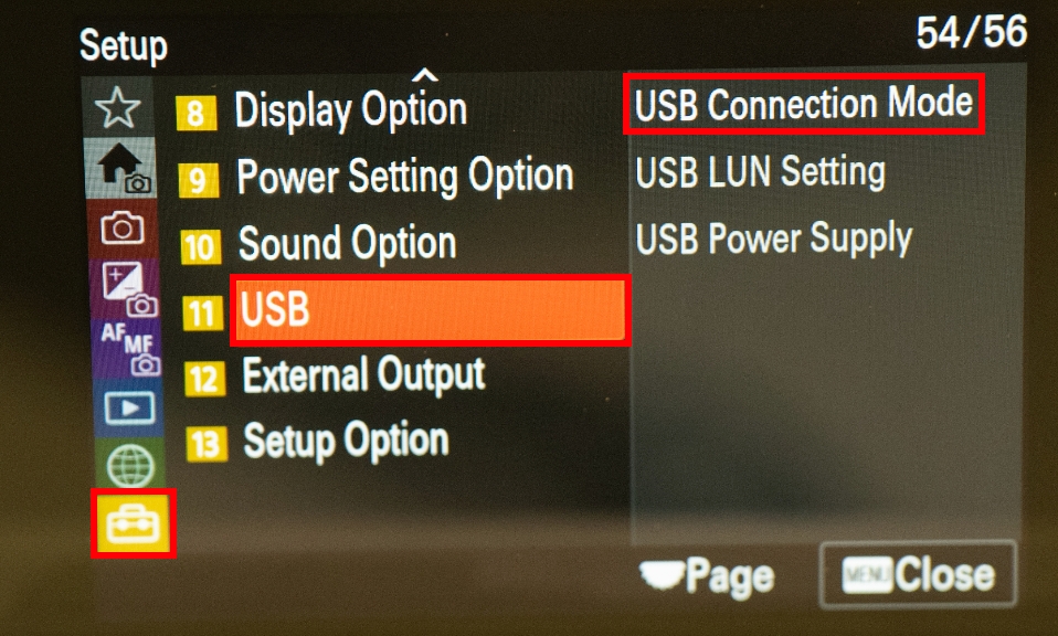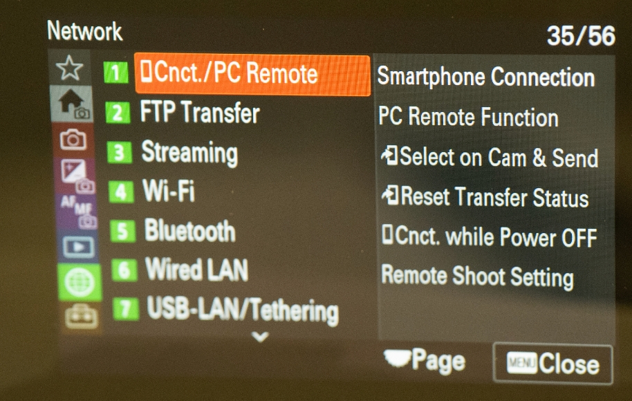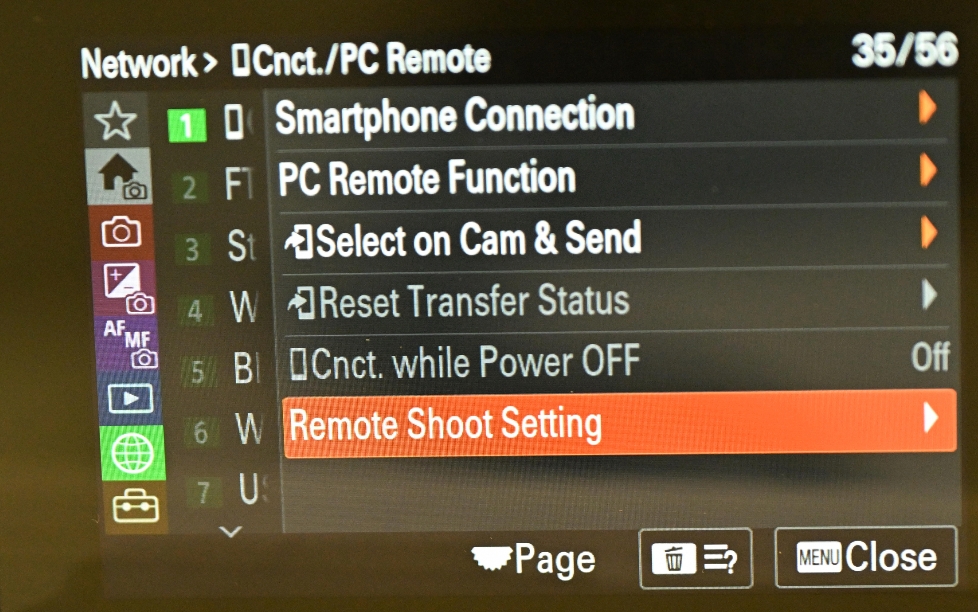 La cámara Sony necesitará configurar el tipo de conexión remota en Modo de Conexión USB → Remoto de PC.