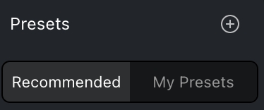 Evoto distingue actualmente entre "Preajustes Recomendados" y "Mis Preajustes".
