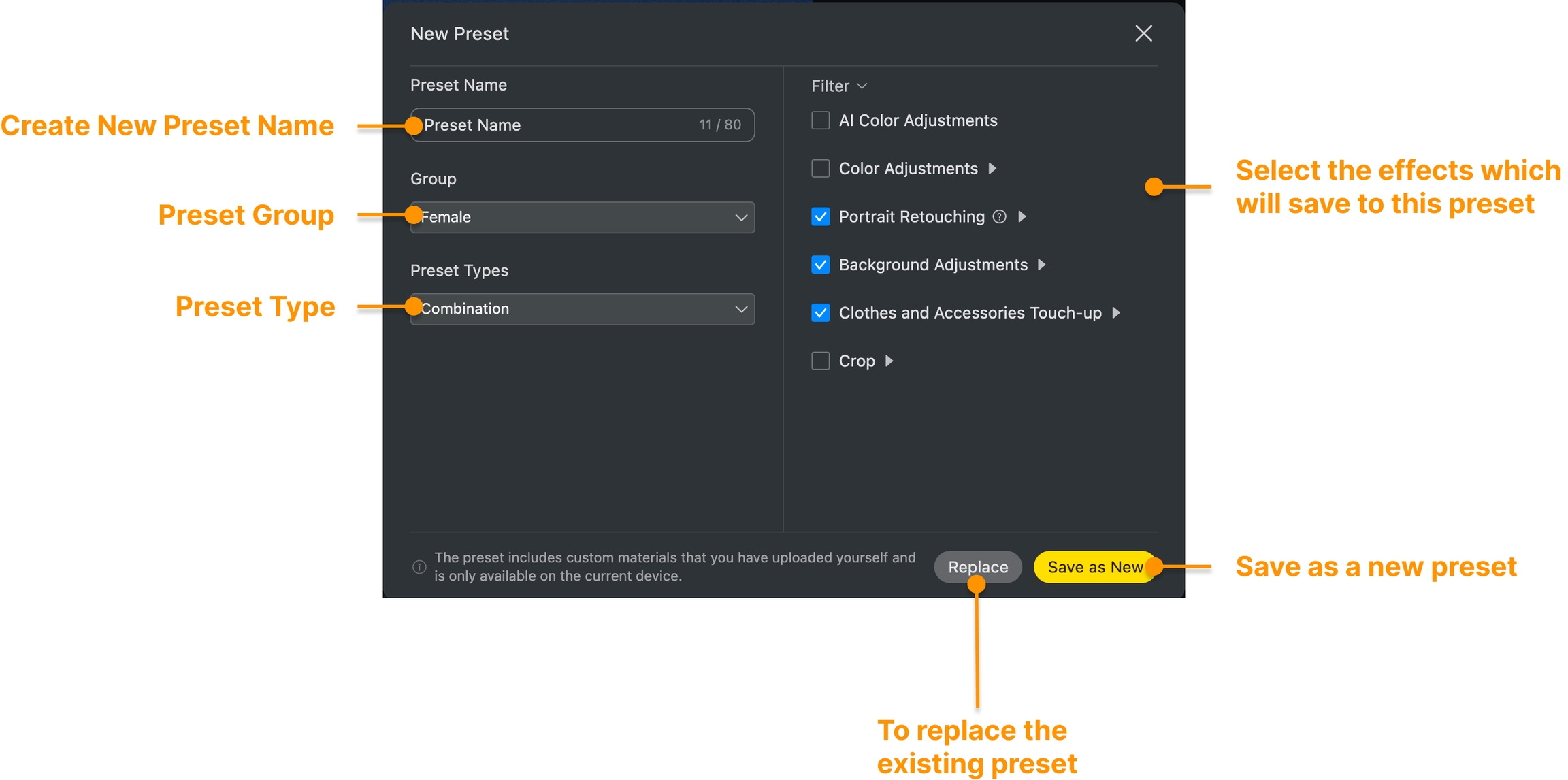 Después de rellenar el nombre del preajuste, seleccione los tipos de preajuste y el grupo de preajustes. Puede seleccionar los efectos que desea guardar en este preajuste y, a continuación, haga clic en Guardar para completar la creación del preajuste.