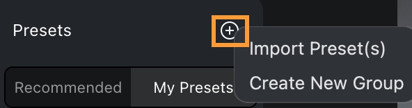 Importar Preajustes – Puede copiar los preajustes de otros con el token de preajuste que le proporcionen. Haga clic en Importar Preajuste y seleccione el grupo de preajustes para importar el mismo preajuste a su cuenta de Evoto.