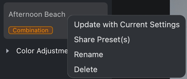 Los Preajustes son una colección de funciones que pueden grabarse juntas y aplicarse a nuevas imágenes con un solo clic.