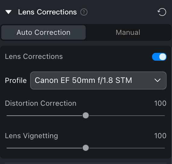 自動補正:システムが「焦点距離・絞り・被写体距離」のデータを正確に識別し、一致した場合、自動レンズ補正が有効になります。