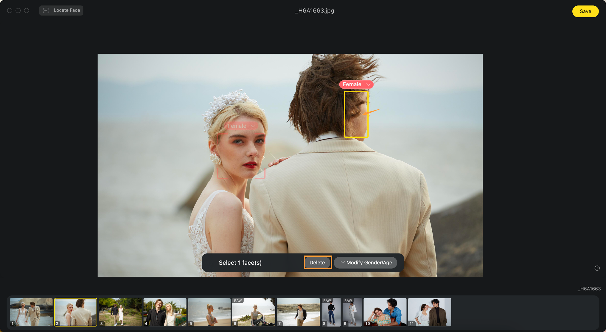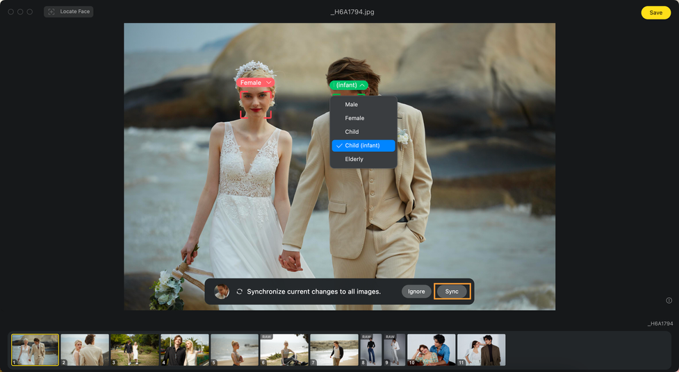 Evotoはインポートされた写真を自動的に分析し、写っている人物の性別と年齢を識別して、それぞれに合わせたキャラクタータグを生成します。この機能により、異なる性別や年齢のキャラクターに対して適切な修正が可能で、修正が完了した際には、性別や年齢に基づく変更を複数の画像に対して一括で同期することができます。このバッチ同期機能により、複数の画像を同時に処理することができ、作業効率が向上し、迅速かつ正確に同じ修正や調整を適用することが可能です。さらに、単一の人物の調整やその修正結果のバッチ同期もできます。