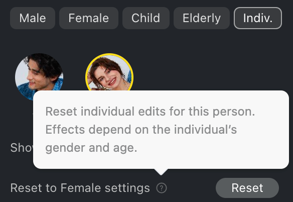 キャラクターに個別編集を適用した後で、そのキャラクターが既に個別のキャラクターに識別されているため、性別/年齢編集に戻ってもそのキャラクターに対する変更は適用されません。個別編集の効果はいつでもリセットできます。リセット後は、個別編集で行った変更は全てクリアされますが、そのキャラクターには性別や年齢に応じた編集が再適用されます。