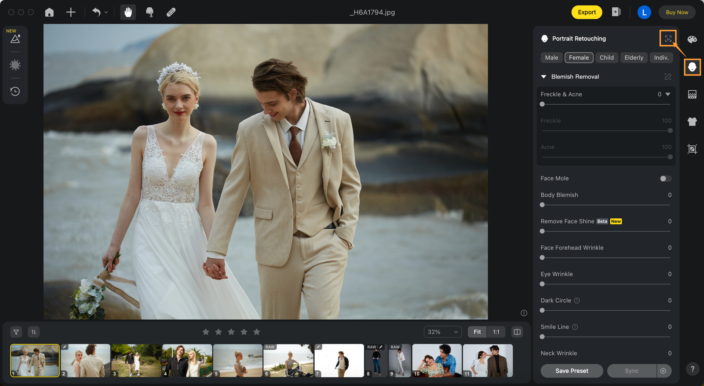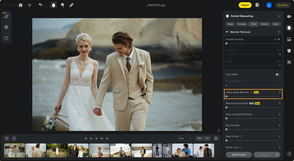 グループ写真のポートレートの修正が完了したら、個別編集ツールを使用して一人ひとりの特徴を細かく調整できます。調整したいキャラクターを選択し、変更したい部分に対して調整したい機能スライダーをドラッグしてください。また、プロジェクト内の同一キャラクターに対する個別編集をバッチ同期することもできます。