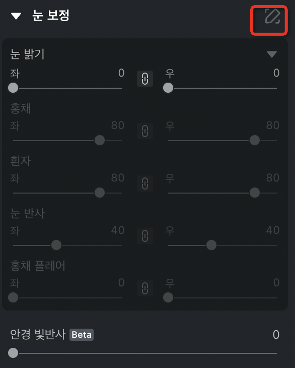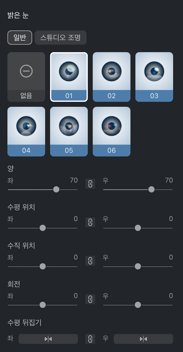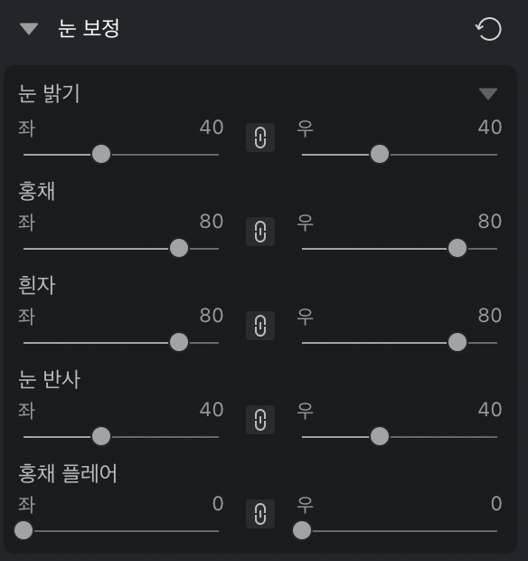 **눈 밝기** - 인물 눈의 전체적인 밝기로, 좌측 및 우측 모두에 대한 부가 기능을 함께 조절할 수 있습니다(연결 조절), 또는 각각 별도로 조절할 수도 있습니다(분리 조절).