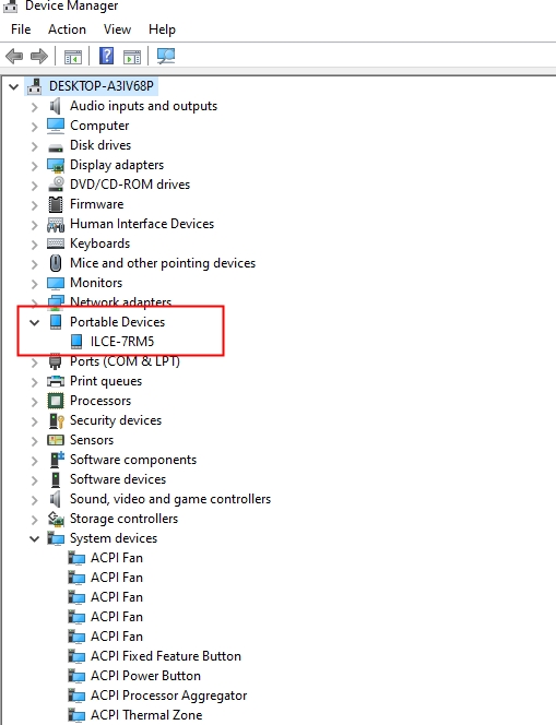 Windows 시스템의 경우, 장치 관리자로 이동하여 휴대용 장치 아래에서 카메라가 컴퓨터에 연결되었는지 확인합니다.
