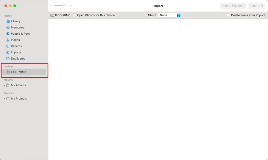 MacOS 시스템의 경우, "사진" 앱을 열고 "장치" 아래에서 카메라가 컴퓨터에 연결되었는지 확인하십시오.