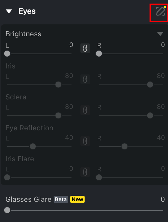 **Brightness –** The overall brightness of the figure's eyes, and all its sub-feature can be adjusted together with both the left and right side (**conjunction adjustment**) or separately from each other (**separate adjustment**)