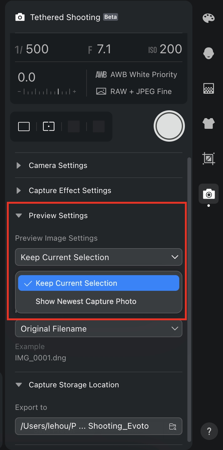 > Currently, Evoto uses the automatically connect method, and users do not need to manually click on the tether connection for the Tether Shooting Feature Section. Once the connection line has been connected to the camera and the computer, it will automatically connect and activate the tether shooting.&#x20;