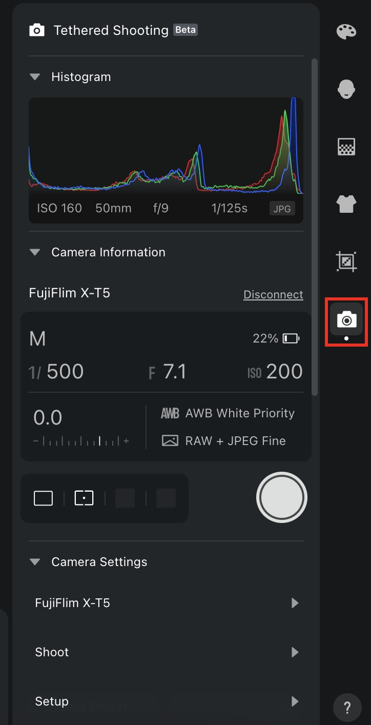 In the Picture Editing Workspace, we add a new feature section for tether shooting. Click on the Tether Shooting Feature Section, to enter the tether shooting.