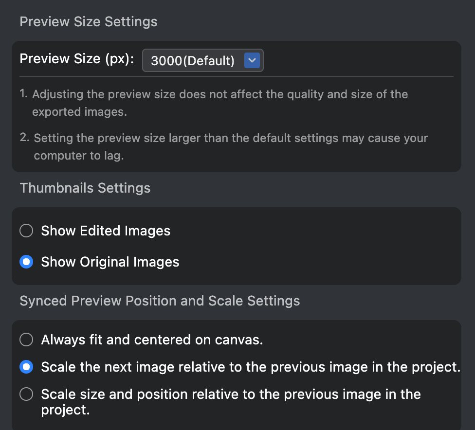 **Preview Size (px) –&#x20;**<mark style="color:red;">**Please note that in Evoto, we are only showing you the preview image, it is not the original image.**</mark> Usually Evoto will set a default value for you based on the computer settings. Adjusting the preview size will only affect the preview, it won’t have anything applied to the exported pictures.