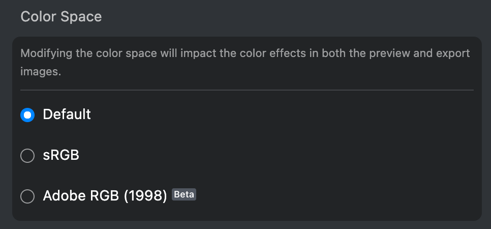 <mark style="background-color:green;">**( 🆕 version 3.7 🆕 )**</mark>**&#x20;Color Space Settings –** Added color space options in Preview Settings, allowing users to manually select between sRGB and Adobe RGB.