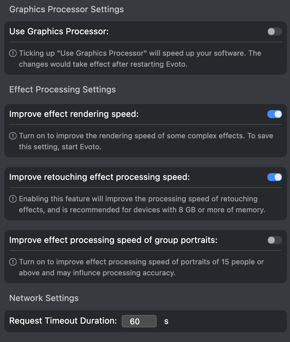 **Improve effect rendering speed –** enable to increase the processing speed for rendering, but the processing speed will mainly depend on the device you are using. To apply the setting, enable and reopen the Evoto.