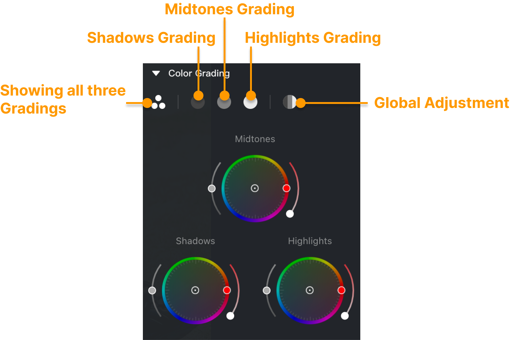 Việc phân loại màu sắc chia hình ảnh thành ba phần: Vùng sáng, Bóng, và Vùng trung tính. Nó cung cấp một lựa chọn để điều chỉnh ba vị trí khác nhau một cách riêng lẻ. Chọn phần cần chỉnh và kéo dấu chấm để chỉnh màu. Càng gần trung tâm thì độ bão hòa càng thấp. Càng gần mép, độ bão hòa màu càng cao.